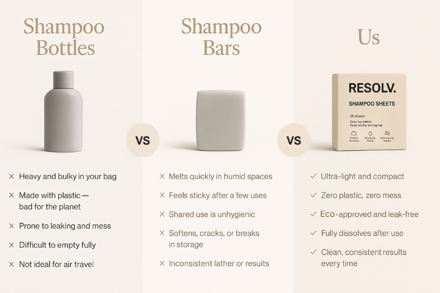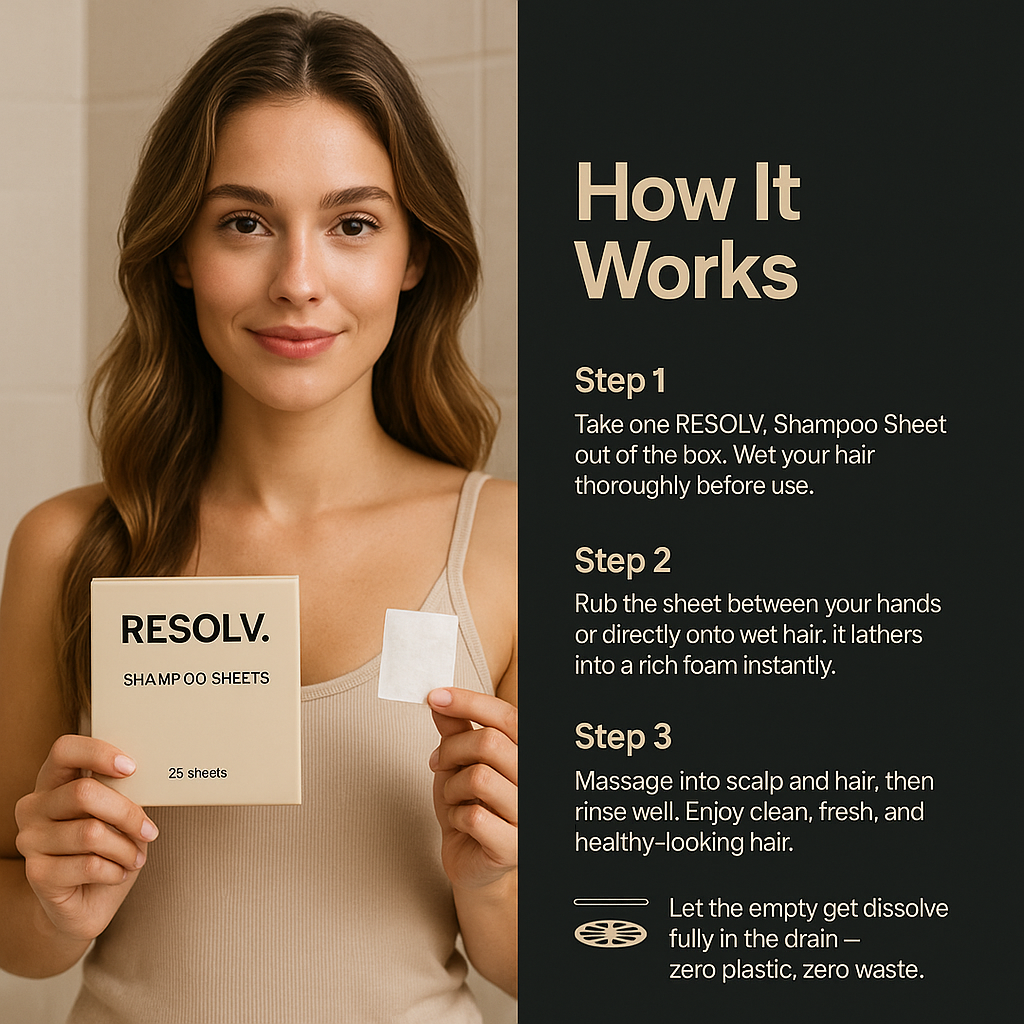Born from a simple idea on the road, clean hair shouldn’t come with plastic waste or heavy bottles. RESOLV. was created for travellers, minimalists, and eco-thinkers who want premium care without compromise. Each dissolvable shampoo sheet delivers a rich, salon-quality wash in seconds — no mess, no plastic, no guilt.