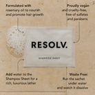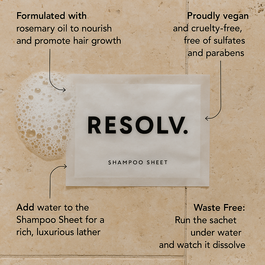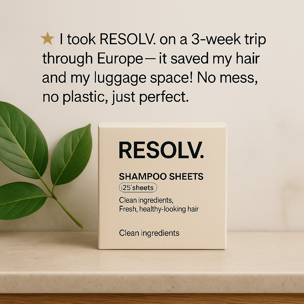 Born from a simple idea on the road, clean hair shouldn’t come with plastic waste or heavy bottles. RESOLV. was created for travellers, minimalists, and eco-thinkers who want premium care without compromise. Each dissolvable shampoo sheet delivers a rich, salon-quality wash in seconds — no mess, no plastic, no guilt.